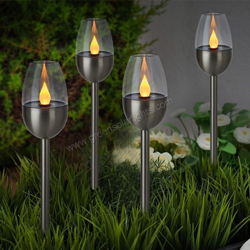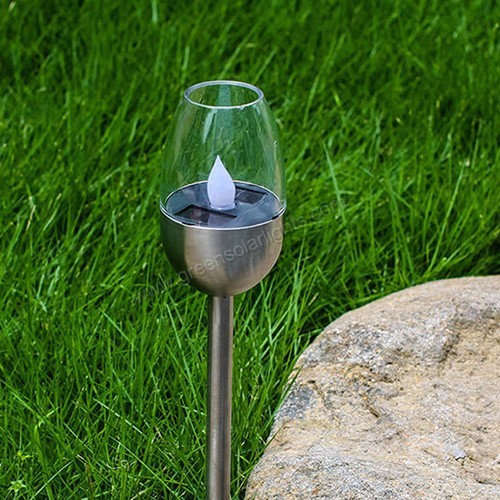 This solar candle torch garden stakes add the perfect accent lighting to your garden. The flameless torch design mimics a real candle flame within a hurricane-style lamp, making them a beautiful addition to any garden. Solar candle stakes offer a wonderful, smoke-free, and maintenance-free way to bring a romantic touch of candlelight to your outdoor space. Add stylish accent lighting to your garden or pathway with these carefully crafted candle stakes. The solar-powered LED candle flame automatically glows at dusk, simulating a real candle flame—without the risk of fire or smoke. Made from durable, weather-resistant plastic and metal, they require no wiring for easy installation.