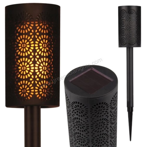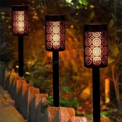 This garden light is made of high-quality ABS plastic, ensuring sturdiness and durability for long-term use. With an IP65 protection rating, it can withstand harsh weather conditions. During the day, expose the solar panel to direct sunlight for a full charge, and at night, the light will automatically illuminate and work for up to 8 hours. Simply turn on the switch, assemble the base, and insert the solar light into the soil. Place the solar panel in an area with sunlight—no tools required. Featuring a charming design and beautiful hollow patterns, this light creates a modern garden decoration. At night, the soft glow combined with the patterned shadows enhances the beauty of your garden. Ideal for use as decorative lighting, gardening accents, tree lights, garden umbrella lights, artistic lamps, front or back door corridor decorations, or outdoor table lamps. You can also mount it on lantern posts and place it on the lawn. The warm light casts enchanting shadows on walls or tabletops, adding a touch of elegance to your terrace.