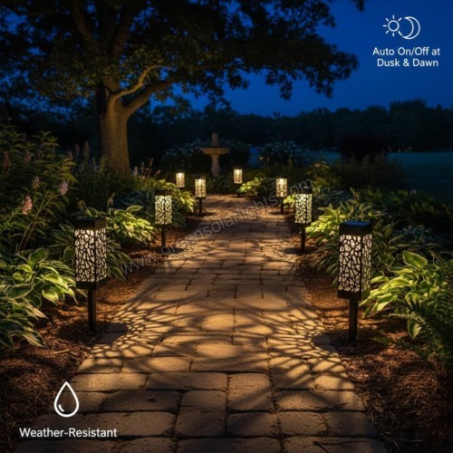 Made of durable materials, this stake light is ideal for gardens, lawns, walkways, courtyards, yards, parks, and more. The exquisite hollow pattern design creates unique and vivid light and shadow effects, fostering a warm and cozy atmosphere. It can also serve as a visual focal point among outdoor potted plants, lighting up your garden at night. The solar pathway light emits a warm glow, making your courtyard even more inviting. This pathway light offers two installation options: with the included stake, it can be inserted into lawns, flower beds, or the ground; without the stake, it can be placed flat on the ground or on a tabletop. Equipped with a high-quality, large-capacity solar panel, it charges during the day and automatically lights up from dusk to dawn. With just 6–8 hours of charging, this eco-friendly courtyard light can softly illuminate your garden for 6–12 hours. Our solar step light creates a more comfortable, brighter, and safer home environment, giving your family peace of mind when returning home at night or going out for a walk. IP44 Waterproof & Durable: This solar wall light is made of ABS material and features an IP44 waterproof rating, allowing it to withstand various outdoor environments, including rain, snow, and extreme temperatures. This waterproof solar light is corrosion-resistant, ensuring a long service life and lasting durability.